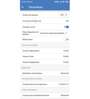 Le paramétrage de votre chargeur MPPT doit impérativement correspondre à la chimie de vos batteries. Les batteries Lithium, AGM, Gel ou plomb ouvert nécessitent des profils de charge différents avec des tensions d'absorption, de maintien et de déconnexion spécifiques. Les MPPT SmartSolar Victron Energy proposent huit algorithmes préprogrammés sélectionnables, ou une programmation totalement personnalisable via l'application VictronConnect. C’est l’un des gros avantages de Victron.